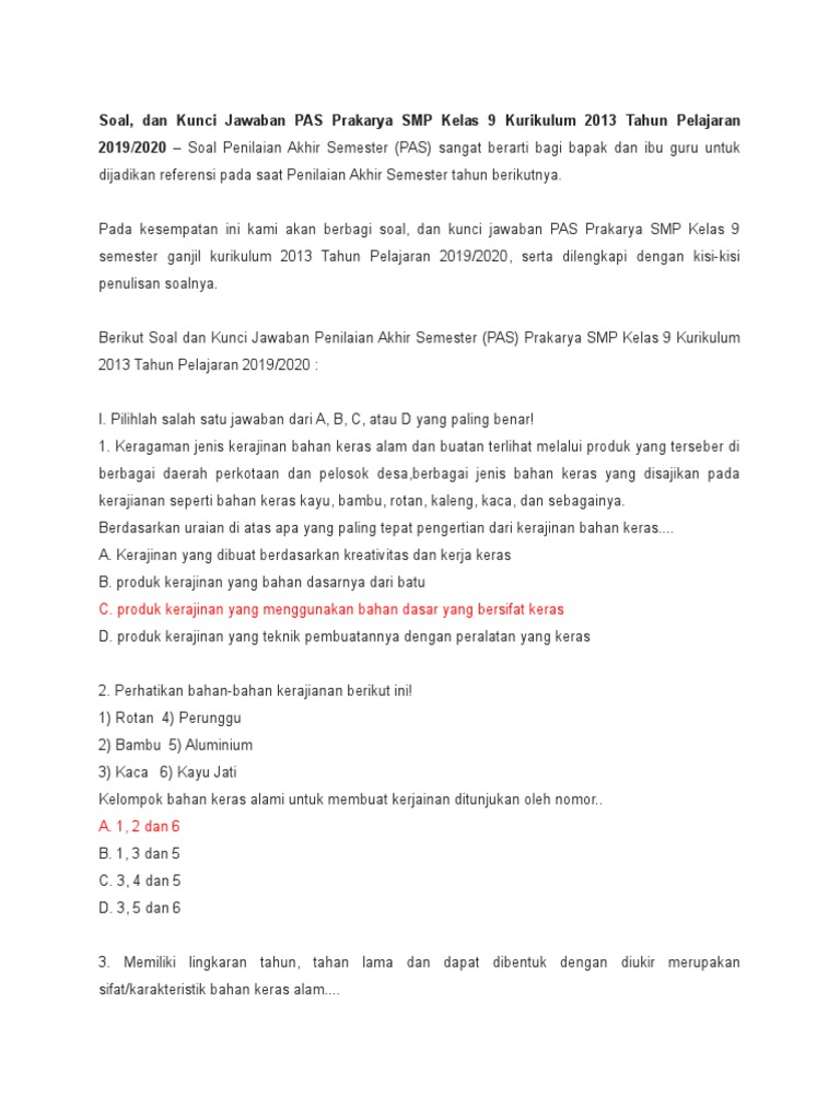 Kunci jawaban pas prakarya 9 k 13.docx. Sep 21, 2020 · soal dan kunci jawaban pas prakarya kelas 9 semester ganjil kurikulum 2013 tahun 2019 selamat berjumpa kembali di situs web carakumpul. Sehingga bisa menjadi sebuah ringkasan belajar ataupun rangkuman soal dalam rangka menghadapi pekan ujian akhir semester satu. Contoh soal beserta kunci jawaban yang disajikan adalah berdasarkan kurikulum 2013 revisi terbaru. Dec 06, 2020 · soal dan kunci jawaban pas prakarya smp kelas 9 kurikulum 2013 tahun pelajaran 2019 2020 soal penilaian akhir semester pas sangat berarti bagi bapak dan ibu guru untuk dijadikan referensi pada saat penilaian akhir semester tahun berikutnya.